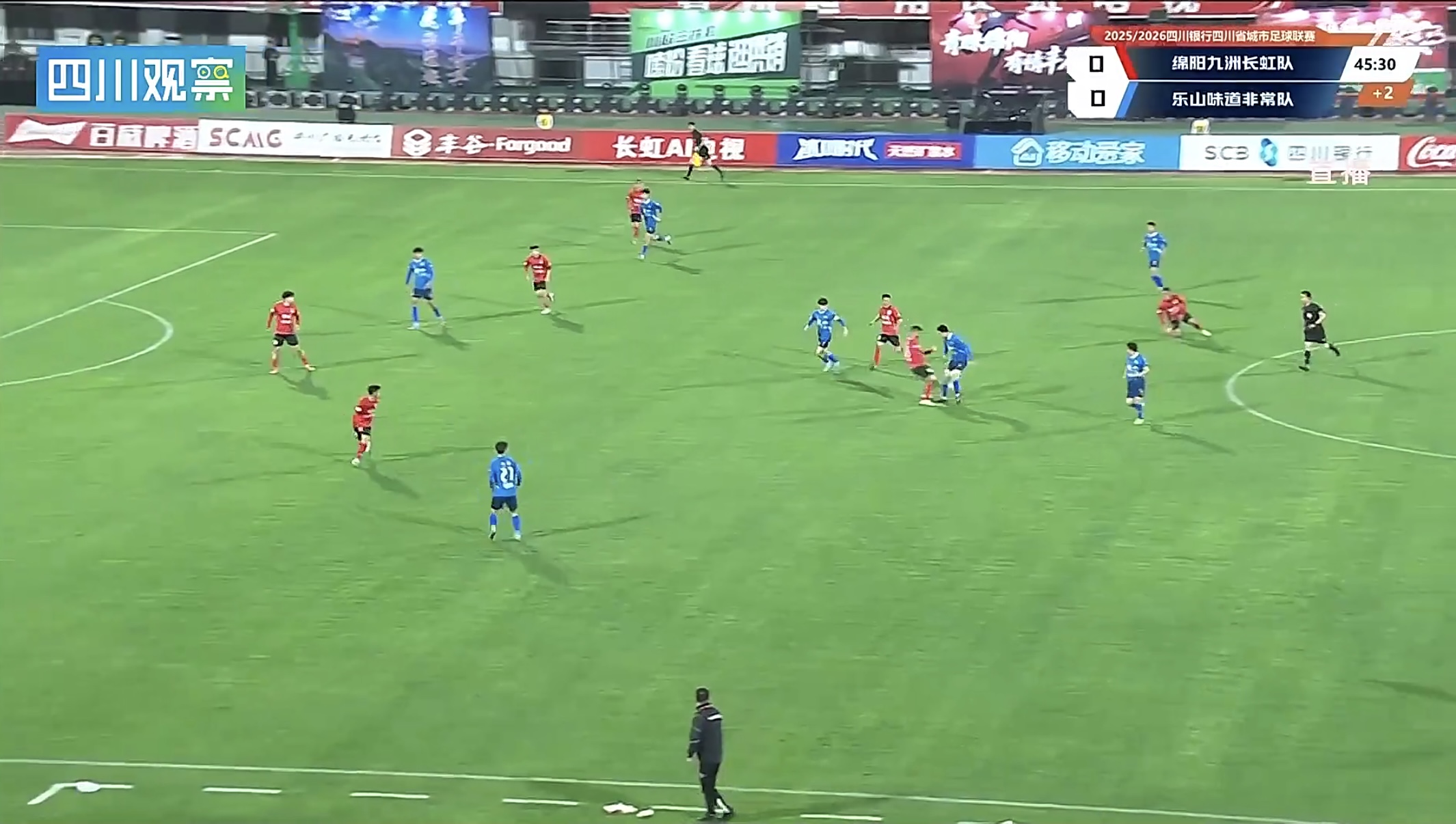 伴随看台上此起彼伏的“绵阳雄起”加油呐喊声,晚上7:35分,哨声响起,本场比赛正式打响。比赛一开始,绵阳队便多次主动发起进攻。虽是客场,乐山队也丝毫不逊色,防守有力。历经45分钟的激烈拼抢,双方都未能取得进球,以0:0的比分进入中场休息。